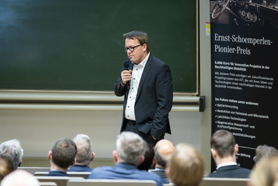 Wir danken der Mercedes-Benz AG die alljährlich das Sponsoring der Veranstaltung übernimmt. Im Rahmen der Carl-Benz-Gedenkvorlesung wurde unter dem Dach des KIT-Zentrums Mobilitätssysteme durch Herrn Achim Quitz, Vorsitzender des Vorstandes der Ernst-Schoemperlen-Stiftung, der traditionelle Ernst-Schoemperlen-Preis an herausragende Doktorarbeiten auf dem Gebiet der Mobilität, sowie erstmal der Ernst-Schoemperlen-Pioneer-Preis für eine aktive Projektgruppe am KIT verliehen.